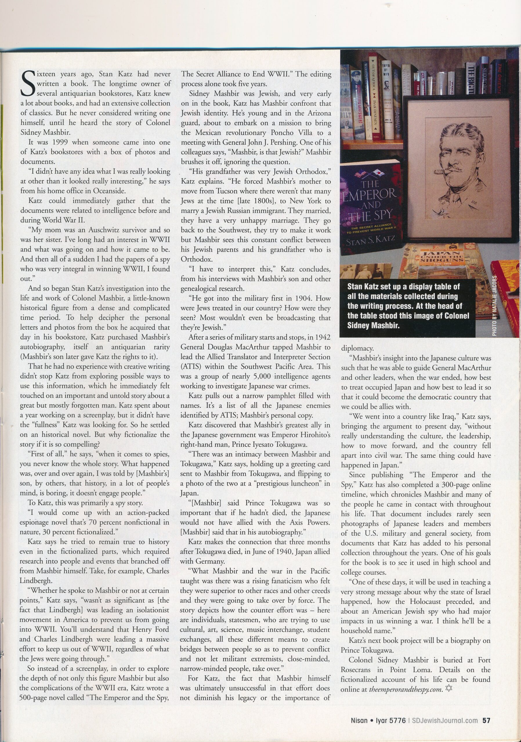 • San Diego Jewish Journal Holocaust Remembrance Edition May 2016 highlights the historical novel, The Emperor and the Spy and the outstanding achievements of Colonel Sidney Mashbir.